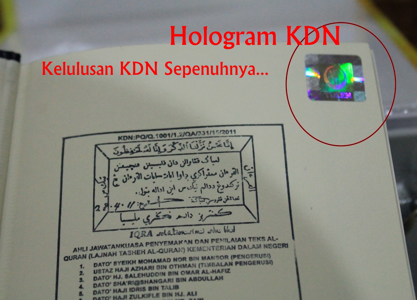 “Saya dapati al-Quran ini tidak menggunakan kaedah Rasm Uthmani yang telah ditetapkan oleh Lembaga Pengawalan Pelesenan dan Percetakan al-Quran KDN, justeru al-Quran ini tiada kelulusan Lembaga kami.