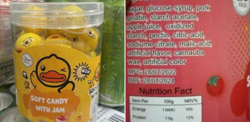 1-JAKIM mendapati produk manisan Soft Candy With Jam yang tidak dinyatakan alamat pengeluar sebenar rentetan terdapat maklumat kandungan bahan mentah produk tersebut yang mengandungi ramuan tidak halal iaitu pork gelatine (gelatin babi) pada label pembungkusan produk.