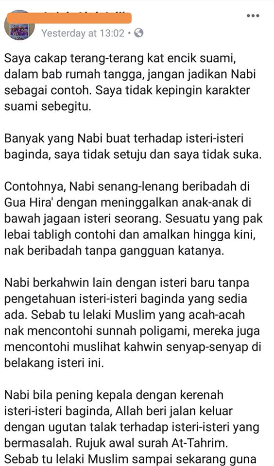BILA Puan tidak mahu jadikan Nabi sebagai contoh dalam bab rumah tangga, adakah Puan bersedia untuk tidak mendapat redha Allah?