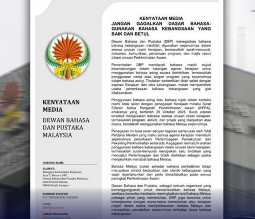 DBP menegaskan bahawa penggunaan bahasa asing atau bahasa rojak dalam konteks rasmi “tidak selari dengan penegasan Kerajaan melalui Surat Edaran Ketua Pengarah Perkhidmatan Awam (KPPA), bertarikh 29 Oktober 2025.” Surat edaran itu menjelaskan bahawa semua urusan rasmi kerajaan, termasuk program, aktiviti, dan projek yang dianjur atau diurus, hendaklah menggunakan bahasa Melayu sepenuhnya.
