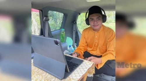 Haikal Firdaus memuat naik gambarnya dalam kereta dengan komputer riba dan iPad diletakkan di atas rehal di hadapannya.