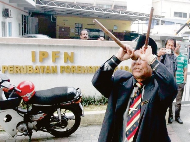 Selepas video itu, Ibrahim sekali lagi melakukan ritual sama di luar Institut Perubatan Forensik Negara (IPFN), Hospital Kuala Lumpur atas kematian Kim Jong-nam petang kelmarin. – Sinar Harian